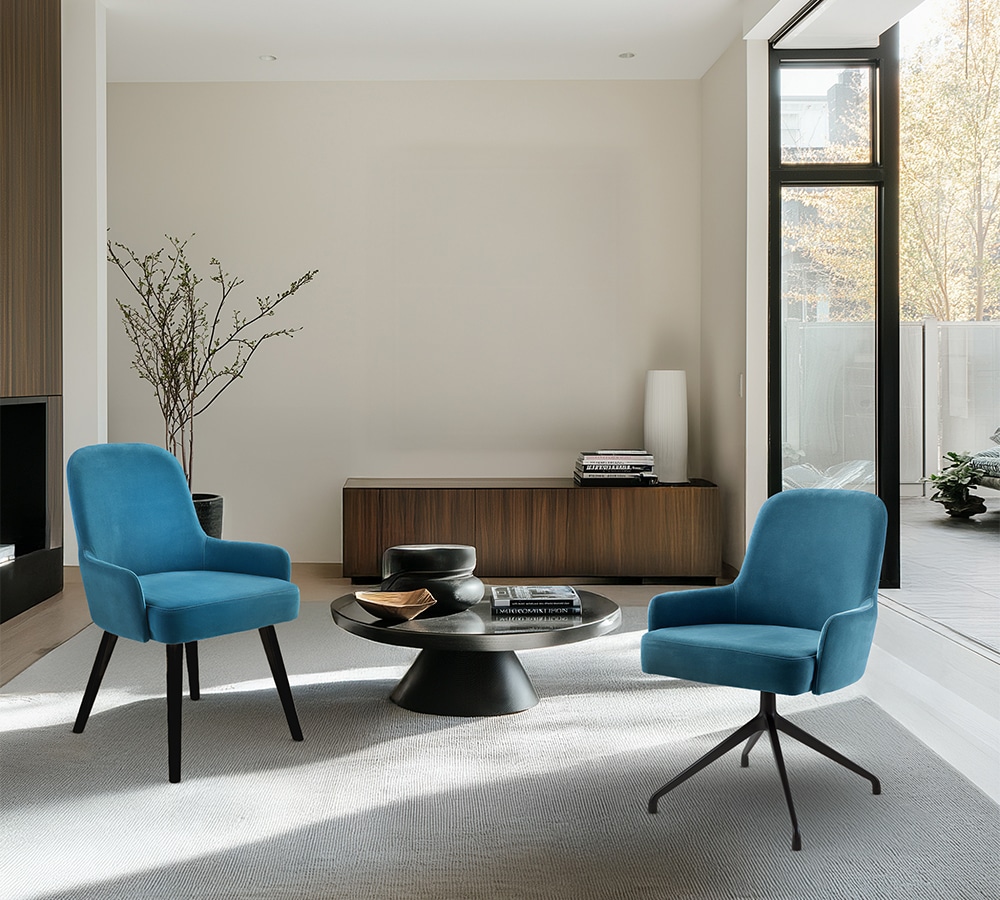 A stylish, high-back lounge and dining chair. Comfortable and strong with a choice of natural or black wooden legs.