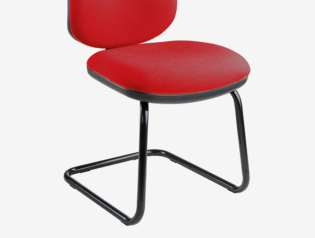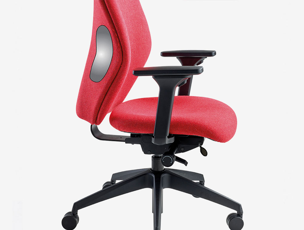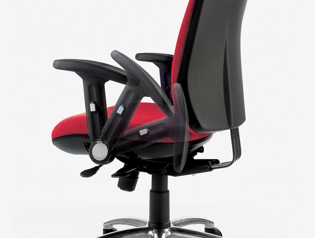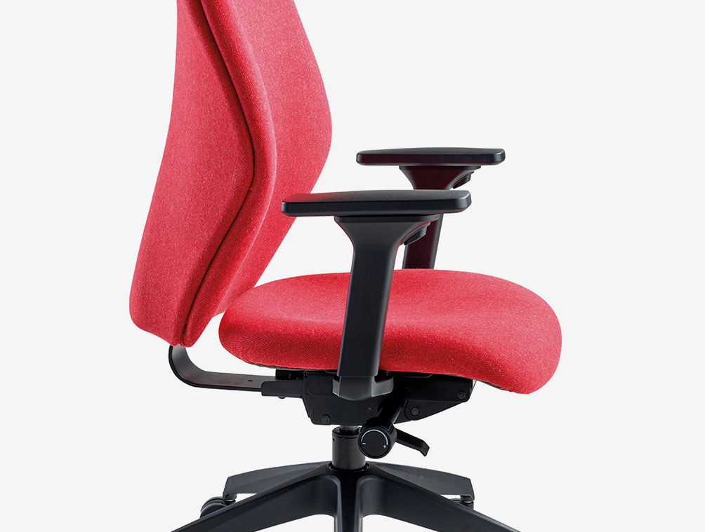 High back task chair with fully supported upholstered back and large contoured seat. Fixed arms. Synchronised mechansim and large 5 star base with twin wheeled castors.