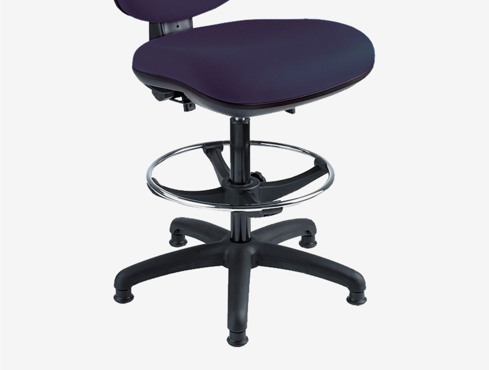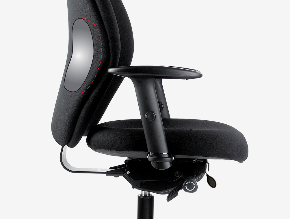 High back operator chair with permanent contact back mechanism, seat and back height adjustment. Fixed arms
