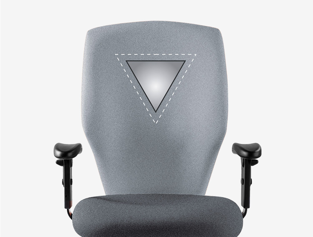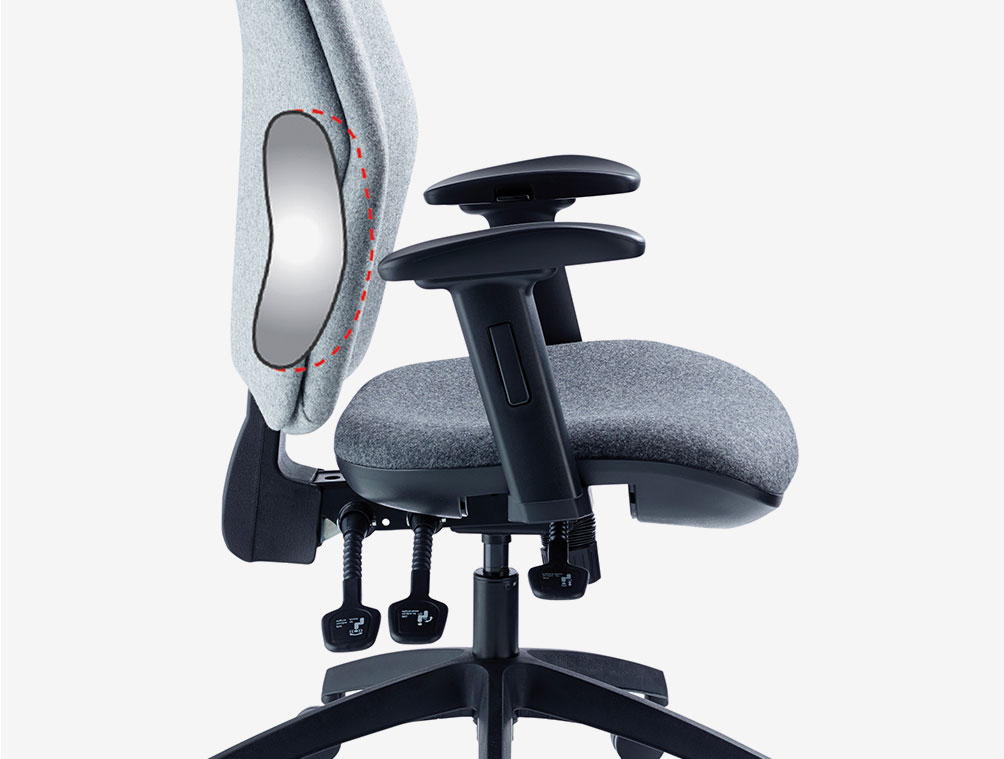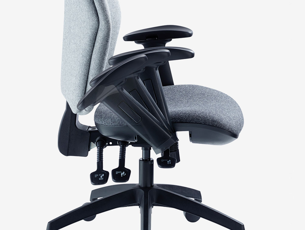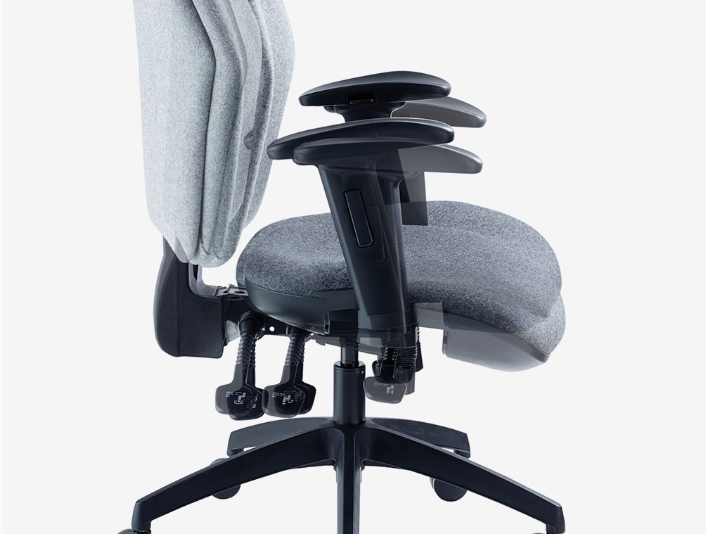 High back ergonomic task chair with headrest, fully supportive back rest and large, contoured seat pad. Independant seat and back adjustment with heavy duty user weight tension control mechanism. Large five star black nylon base with twin wheeled castors.